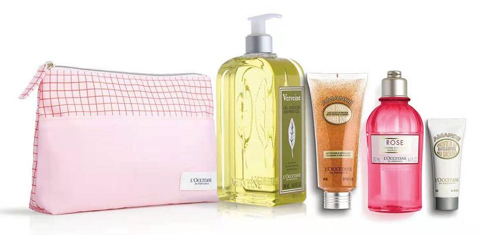 內有精美化妝袋、馬鞭草沐浴啫喱 500ml、杏仁磨砂沐浴啫喱 200ml、玫瑰沐浴啫喱 250ml、杏仁緊膚乳 20ml