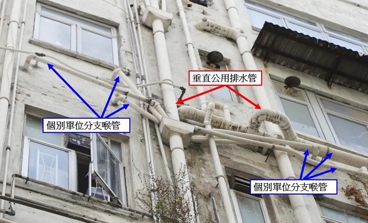 外牆垂直公用排水管一般由全體業主共同負責維修保養;至於從個別單位連接至垂直排水管的分支喉管則由該單位業主負責。