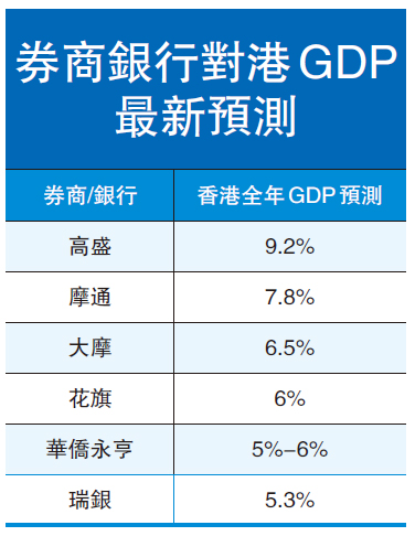 在最新調整香港全年GDP預測的券商及銀行中,高盛對本港經濟最樂觀。高盛將香港今年的GDP增長預測,由原本的4.6%大幅上調至9.2%。該行指,香港首季GDP反彈主要反映強勁的出口表現,而私人消費仍低迷,惟預期香港經濟將持續改善,尤其是環球經濟恢復及社交距離措施將逐步放寬。