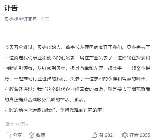 「今天萬分難過,貝殼創始人、董事長左暉因病離開了我們。貝殼失去了一位奠定我們事業和使命的創始者,居住產業失去了一位始終在探索和創新的引領者。從鏈家到貝殼,極其有幸和左暉一起共事,一起奮鬥拼搏,一起推動行業進步的我們,失去了一位親密的夥伴和智慧的師長。左暉曾經講過:我們這個時代企業經營者的宿命,就是要去幹煙花背後的真正提升基礎服務品質的苦活、累活。左暉的精神永遠激勵我們,堅持做難而正確的事!」