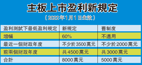 經仔細考慮所有回應後,聯交所修改了諮詢建議,將盈利規定調高60%,有別於原來要求的提高1.5倍或2倍,並修訂盈利分布規定。調高盈利幅度後,主板上市申請人3年營業紀錄期的盈利須在最近一年達3500萬元,前兩年累計達4500萬元,合計共8000萬元。