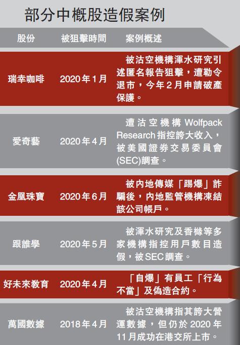 除瑞幸咖啡外,不論是從事新經濟或舊經濟,近年一些赴美上市的中概股被指帳目造假,或誇大營運數據或收入,引致美國金融監管部門介入,例子包括愛奇藝、金凰珠寶以及成功來港第二上市的萬國數據(9698)(見表)。