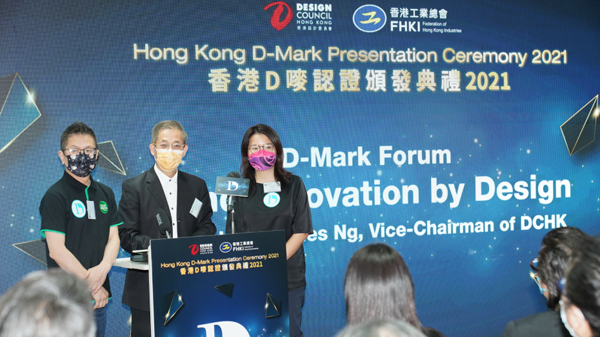 香港工業總會主席葉中賢博士、香港設計委員會主席馮建輝及創意香港助理總監袁賽芳一同主持「香港D嘜認證頒發典禮2021」。