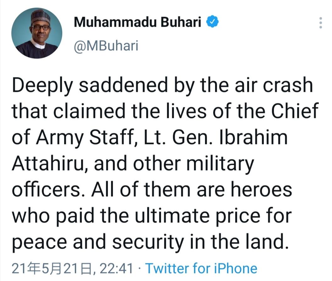 當天,尼日利亞總統布哈里通過社交媒體發文表示,向飛機墜毀事件中身亡的陸軍參謀長易卜拉欣·阿塔希魯(Ibrahim Attahiru)中將及其他遇難者表示哀悼。