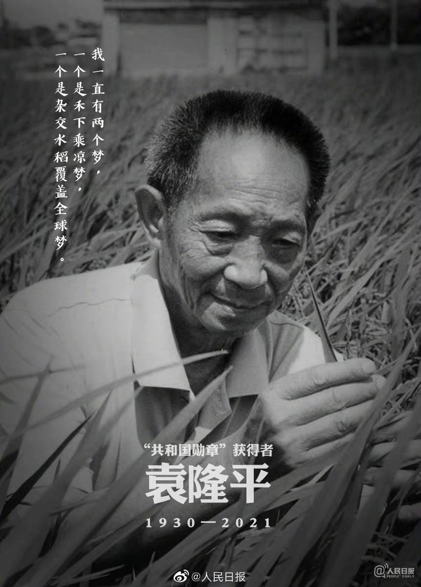 「共和國勳章」獲得者、中國工程院院士袁隆平,因多器官功能衰竭,於5月22日13時07分在長沙逝世,享年91歲。袁隆平是中國研究與發展雜交水稻的開創者,也是世界上第一個成功利用水稻雜交優勢的科學家,是享譽世界的「雜交水稻之父」。「禾下乘涼夢」是他一生的夢想,「發展雜交水稻,造福世界人民」是他的孜孜追求。