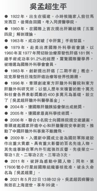 2019年,97歲的吳孟超退休,因長時間握手術刀,他的右手食指、無名指的關節都已變形。吳孟超曾說:「一個好醫生,應該眼裏看的是病心裏想的是病人,我就想當這樣的好醫生。」他用實踐證明了自己。(記者伍敬斌)