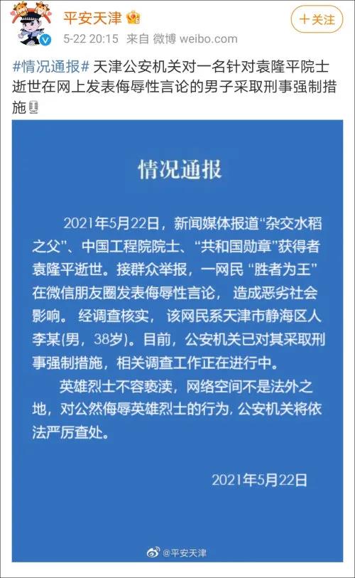 據天津市公安局官方微博消息,2021年5月22日,新聞媒體報道「雜交水稻之父」、中國工程院院士、「共和國勳章」獲得者袁隆平逝世。接群眾舉報,一網民「勝者為王」在微信朋友圈發表侮辱性言論,造成惡劣社會影響。目前已被採取刑事強制措施。