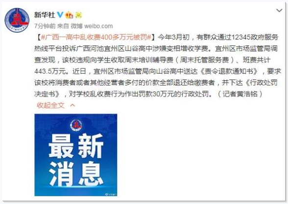 據新華社官方微博消息,今年3月初,有群眾通過12345政府服務熱線平台投訴廣西河池宜州區山谷高中涉嫌變相增收學費。宜州區市場監管局調查發現,該校違規向學生收取周末培訓輔導費(周末託管服務費)、班費共計443.5萬元。