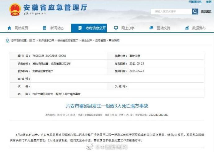 據安徽省應急管理廳網站消息,5月22日16時03分,六安市霍邱縣城關鎮城北第二污水處理廠淨化管網工程一標段工地進行頂管作業時發生塌方事故,造成3人被困。霍邱縣立即組織有關部門和力量展開營救,3人相繼被救出,但均無生命體徵。事故原因和善後處置工作正在進行中。