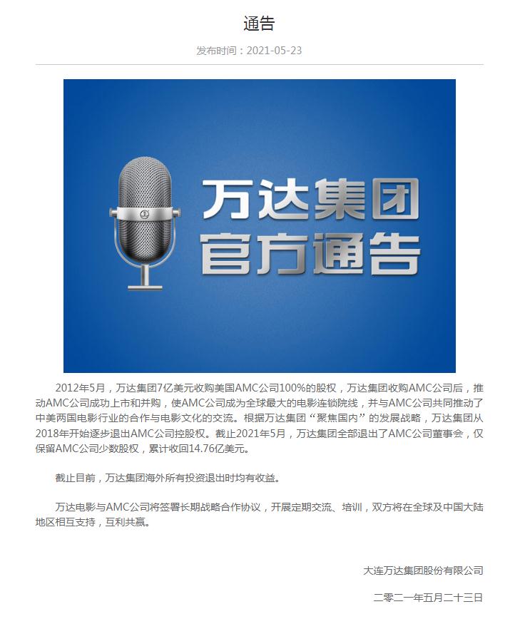 根據集團通告,萬達在2012年5月以7億美元收購AMC全數股權,直至2018年開始逐步退出AMC 控股權。截止2021年5月,萬達僅保留AMC公司少數股權,累計收回約14.76億美元(約115.13億港元)。集團在聲明中指,旗下萬達電影與AMC將簽署長期戰略合作協議,開展定期交流、培訓,雙方將在全球及中國大陸地區相互支持,互利共贏。