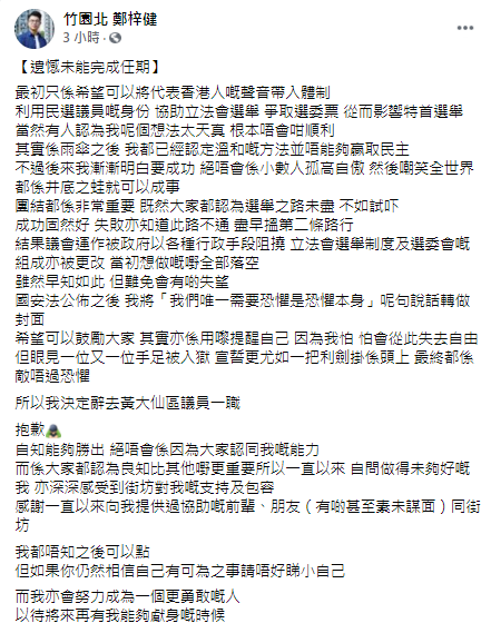 黃大仙竹園北區議員鄭梓健下午宣布,決定辭去黃大仙區議員一職。他下午在社交媒體發文指,「當初想做嘅嘢全部落空」,並指「宣誓更尤如一把利劍掛喺頭上」 ,自己最終「敵不過恐懼」,因此決定辭去黃大仙區議員一職。他還指,對於未能完成任期一事感到遺憾。