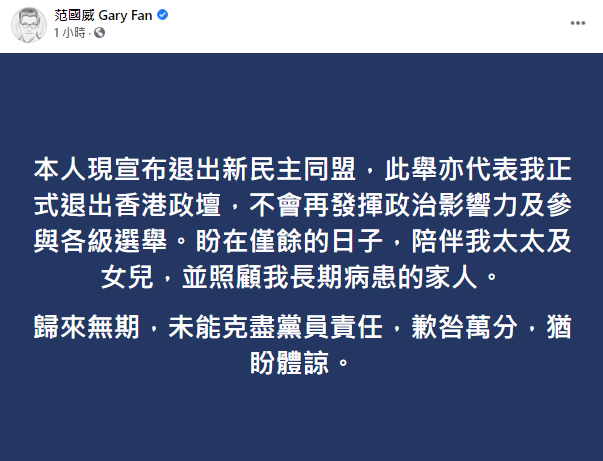 因涉47名攬炒派「35+初選」案仍在還柙的范國威,今日下午在社交媒體宣布退出新民主同盟,同時正式退出香港政壇。