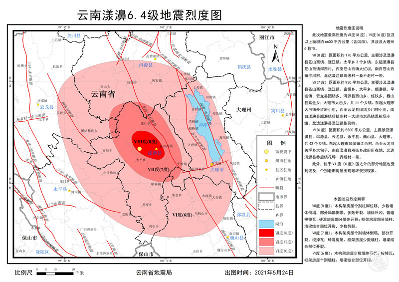 5月25日,經報請應急管理部、中國地震局同意,雲南省地震局發布雲南漾濞6.4級地震的烈度分布圖。