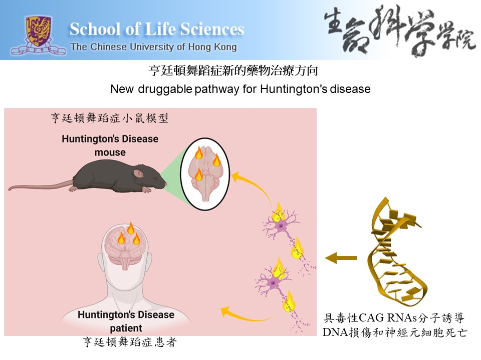 香港中文大學生命科學學院陳浩然與美國伊利諾伊大學厄巴納–香檳分校及意大利比薩大學科研團隊的合作研究揭示,一種新型毒性小分子CAG RNAs(簡稱sCAG)會嚴重破壞神經細胞DNA的穩定性,引發亨廷頓舞蹈症。