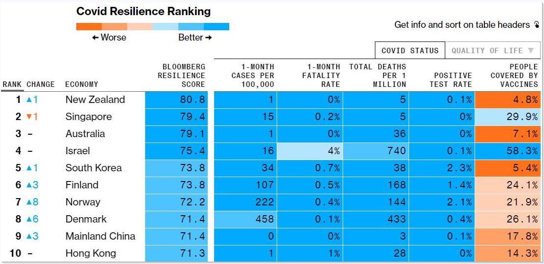 彭博抗疫表現前10名依次為:新西蘭、新加坡、澳洲、以色列、韓國、芬蘭、挪威、丹麥、中國內地及中國香港。
