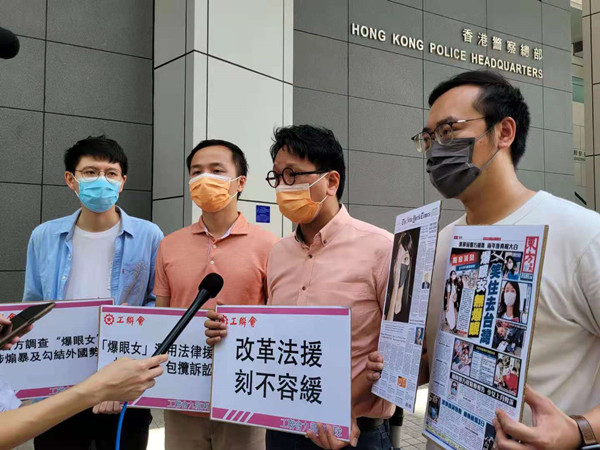 工聯會九龍東總幹事鄧家彪與數名成員今日(26日)到灣仔警察總部請願遞信,要求警方立案調查「爆眼少女」有否涉及勾結外國勢力、癱瘓香港,並發出通緝令,警方亦應調查其文宣和法律團隊。