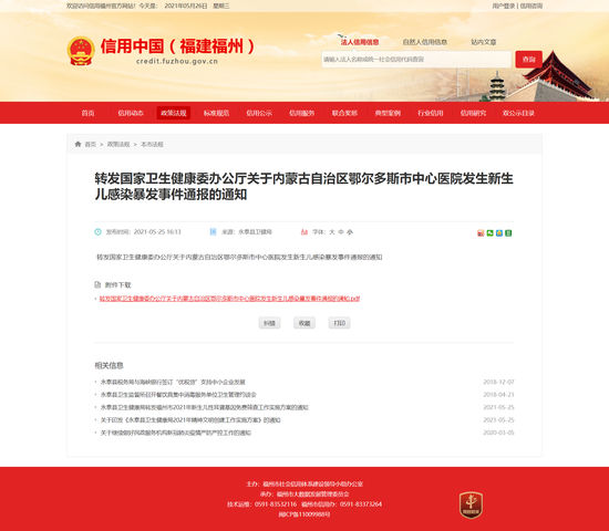 據信用中國(福建福州)網站5月25日消息,福建省福州市永泰縣衛健局近日作出《轉發國家衛生健康委辦公廳關於內蒙古自治區鄂爾多斯市中心醫院發生新生兒感染暴發事件通報的通知》。