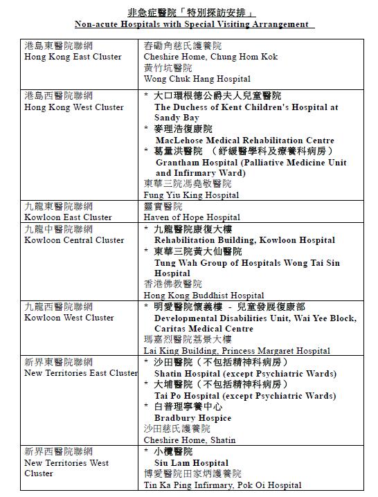 醫管局發言人表示,新增特別探訪安排的共有10間醫院,每間病房會根據實際運作情況安排探病限額,病人家屬必須經由病房職員預約探訪登記,有關職員將會於未來數日致電聯絡,家屬無需自行聯絡醫院。