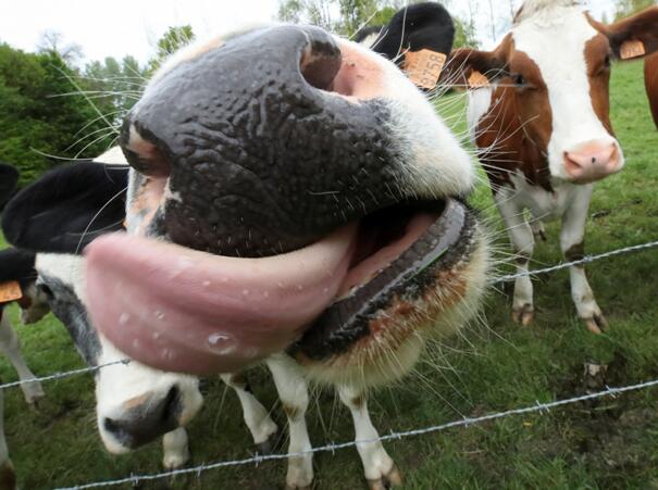 當地時間 5月20日,比利時Eghezee村附近的牛站在田野之中。其中一隻對着攝像機伸出了大舌頭。