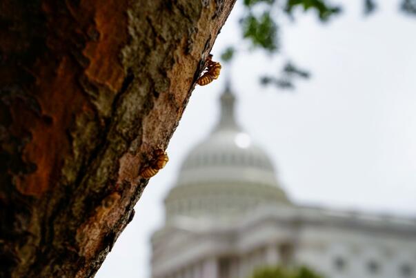 當地時間5月22日,在美國華盛頓,一隻蟬的空殼附在美國國會大廈附近的一棵樹上。