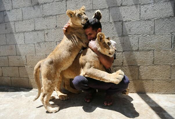 當地時間5月23日,在加沙地帶南部的汗尤尼斯,一名巴勒斯坦男子在房屋屋頂與寵物小獅子玩耍。