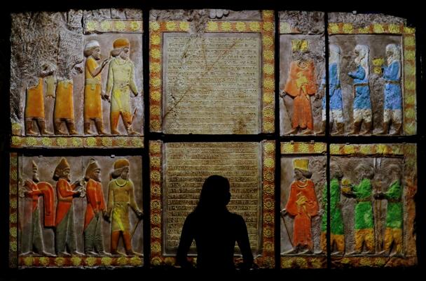 當地時間5月23日,在英國倫敦,一名博物館的員工正在觀看石膏上的彩色畫像。
