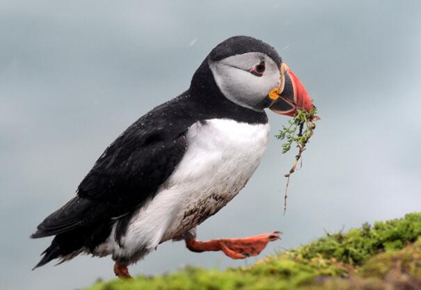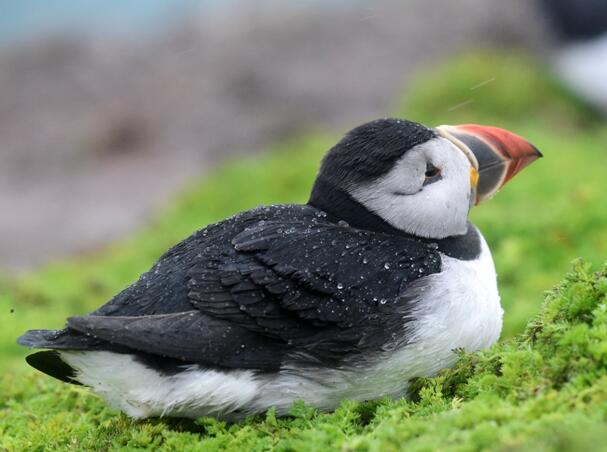 當地時間5月24日,在英國威爾斯的斯科默島,一隻大西洋海雀在雨中現身。