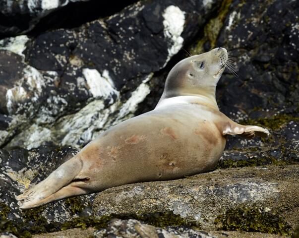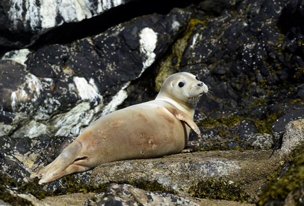 當地時間5月24日,在英國威爾斯的斯科默島,一隻海豹在岩石上休息。