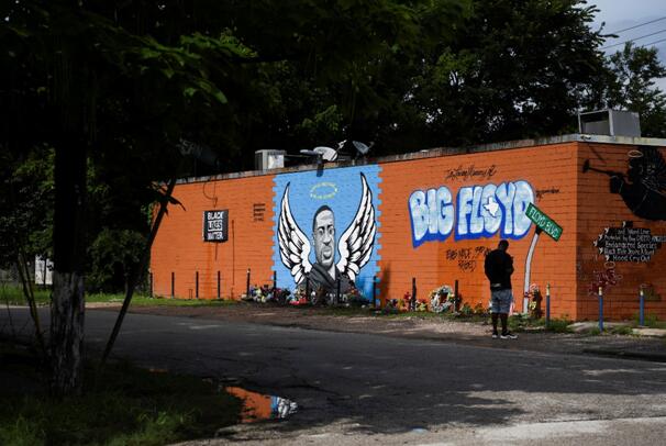當地時間5月25日,在美國德州休斯頓,一名男子站在弗洛伊德的壁畫旁,紀念他去世一周年。