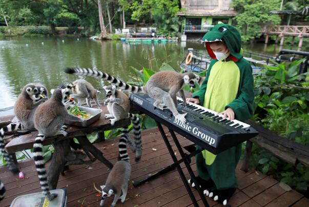 當地時間5月26日,在泰國的一家動物園,一位小女孩在公園中彈琴,她的身邊圍繞著一群狐猴。