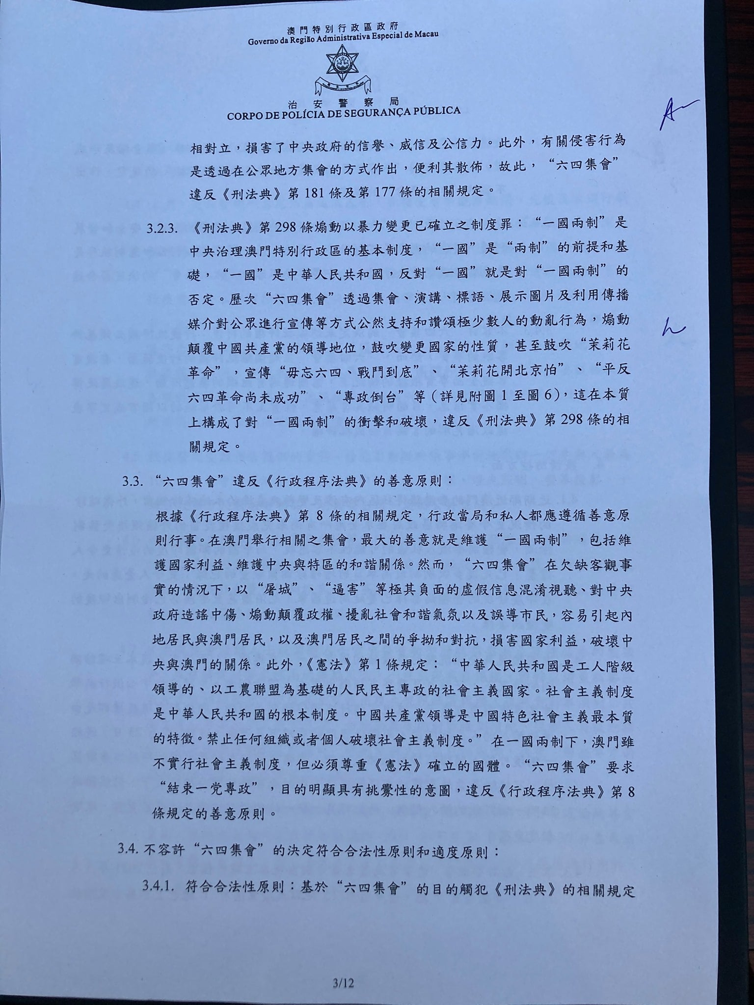 澳門警方於回覆民聯會預告的批示中指出,民聯會以往六四集會透過展示「專政倒台」、「屠城」、「中共政權禍國殃民」等圖片及文字,與中央對六四事件的定性相對立,煽動顛覆中國共產黨領導地位,違反刑法典第177條(公開及詆毀)、181條(侵犯行使公共當局權力之法人)及298條(煽動以暴力變更已確立之制度),並違反了行政程序法典的善意原則。警方認為,是次預告集會的目的,具有相同的違法性質,故此不批准有關集會。