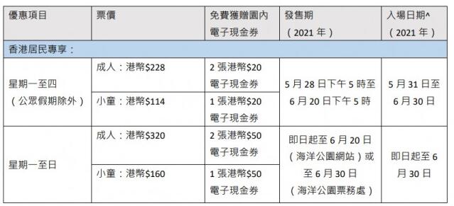 而適用於任何日子入埸的港人限定門票優惠,6月20日前於海洋公園網站有售,海洋公園票務處將發售此優惠門票至6月30日。