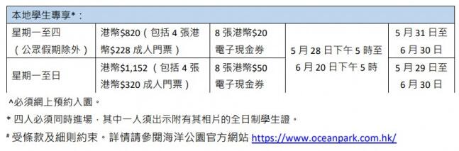 此外,海洋公園還特別推出學生專享套票優惠,本地全日制學生可享兩款專屬套票,除包括4張特價成人門票外,套票更附送合共8張園內電子現金券,總值最高達港幣$400。