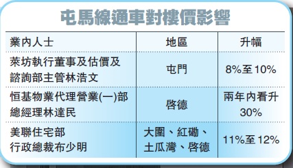 美聯物業住宅部行政總裁布少明認為,屯門惠及周邊沿線的地區,買賣和租賃價格都會因此上升。土瓜灣、啟德、紅磡和大圍樓價都會因為通車有幫助、跑贏大市。對於影響的程度,他認為只會在整體樓價的基礎之上,再推高1至2個百分點,今年整體樓價升一成,那麼上述地區的樓價則升11%至12%。