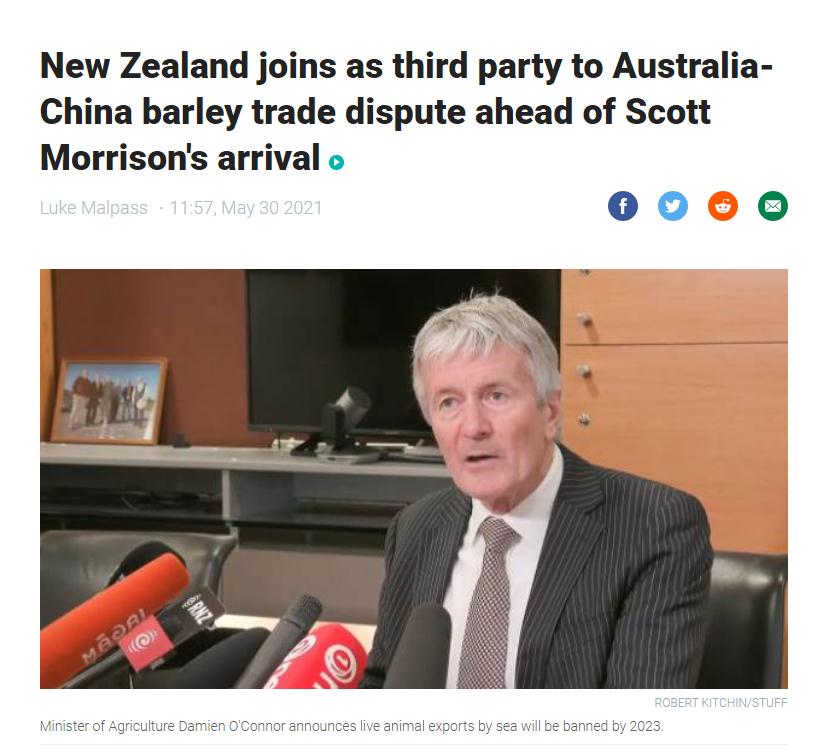 就在莫里森飛抵新西蘭前夕,新西蘭貿易和出口部長奧康納(Damien O'Connor)昨天向紐西蘭新聞網站Newshub證實,紐西蘭將會支持澳洲,就中國針對澳洲大麥開徵80%關稅一事向WTO提出申訴。