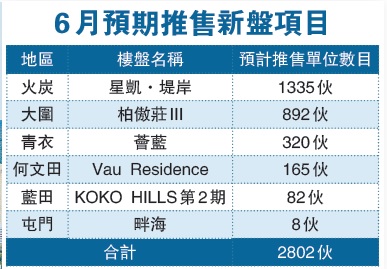 隨着本港疫情緩和,低息持續、剛性需求及投資者入市帶動下,5月發展商加快推盤步伐,新盤累售約2033伙,為過去半年單月新高。踏入6月,發展商承接5月份的推盤速度,估計6月有機會推售的新盤逾2800伙登場(詳見表)。