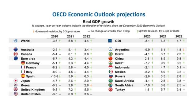 報告中指出,世界經濟現已恢復到大流行前的水平,但距離到2022年底前的預期增長水平仍相差很大。儘管經濟復蘇將使得世界大多數國家的經濟增長在2022年年底前恢復到新冠疫情全球大流行之前的水平,但這還遠遠不夠。全球經濟仍未達到大流行前的增長速度,在多個經合組織國家中,到2022年年底,經濟活動將無法回到疫情危機前的預期水平。預計經合組織各國的增長可能在2021年上升至5.25%,而2022年預計回落至3.75%。中國的經濟增長已經超過新冠疫情危機前的水平,預計在2021年和2022年將保持平穩。