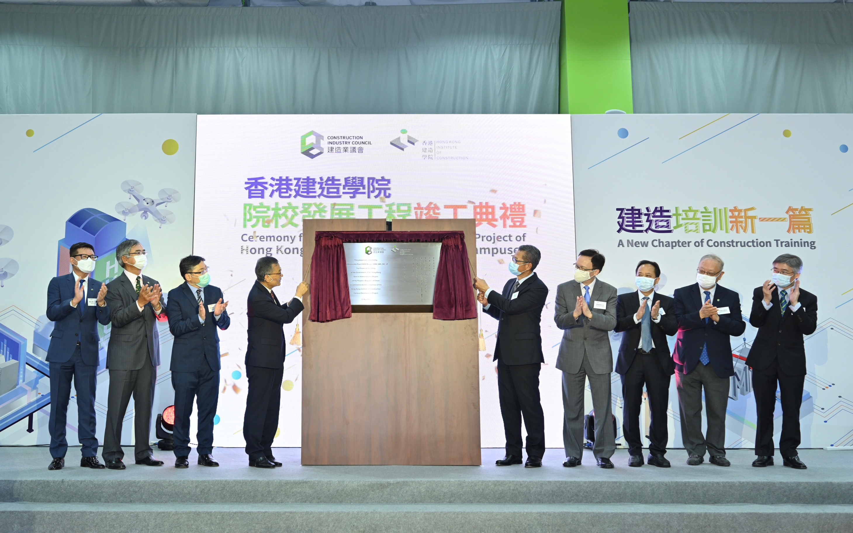 香港建造學院今日(31日)在上水院校舉行院校發展工程竣工典禮,並邀請到財政司司長陳茂波擔任主禮嘉賓,一同慶祝學院位於九龍灣、葵涌及上水3所院校的發展工程順利完成。財政司司長陳茂波與建造業議會主席陳家駒於竣工典禮上一同主持牌匾揭幕儀式。