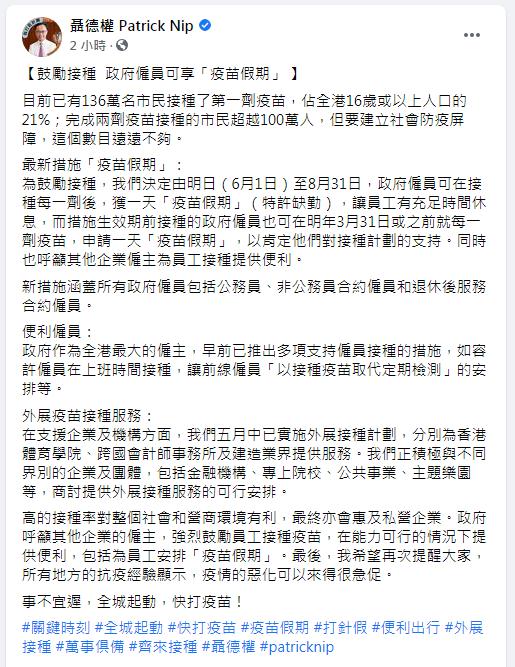 公務員事務局局長聶德權在社交媒體表示,為鼓勵接種,明日起政府僱員可在接種每一劑後,獲一天「疫苗假期」;措施生效期前接種的政府僱員也可在明年3月31日或之前就每一劑疫苗,申請一天「疫苗假期」。同時也呼籲其他企業僱主為員工接種提供便利。