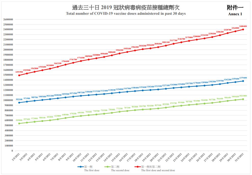 政府透露,接種計劃開展以來,政府已為市民接種共約240萬劑疫苗,當中約138萬名市民已接種第一劑疫苗,其中約59萬接種科興疫苗、約78萬接種復星疫苗;另有約102萬市民已接種第二劑疫苗,包括約43萬名接種科興疫苗、約58萬接種復星疫苗。