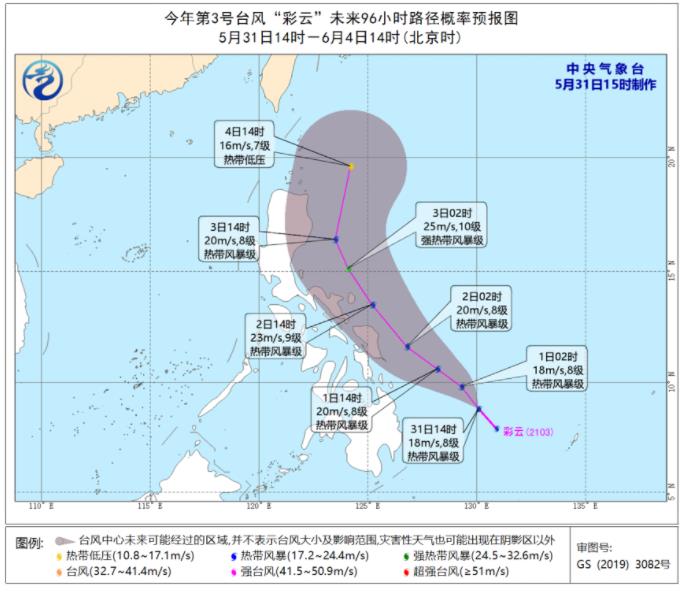 據中國天氣網消息,颱風胚胎99W於今天(5月31日)上午在菲律賓以東洋面生成,為今年第3號颱風「彩雲」。中心附近最大風力有8級(18米/秒),中心最低氣壓998百帕,七級風圈半徑90-120公里。