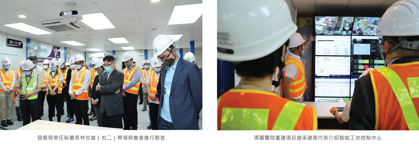 陳家駒其後介紹瑪麗醫院重建工程總承建商應用了很多新科技及智能安全設施協助提升工地安全;工人在進行高危工作前需接受「虛擬實境」訓練,戴上3D 眼鏡進入模擬工地場景,在銀幕感受現場環境;另外為提升工程安全系數,項目採用人面識別開鎖器、智能手帶、智能安全帽、危險範圍警報系統等,為工友提供額外保障。