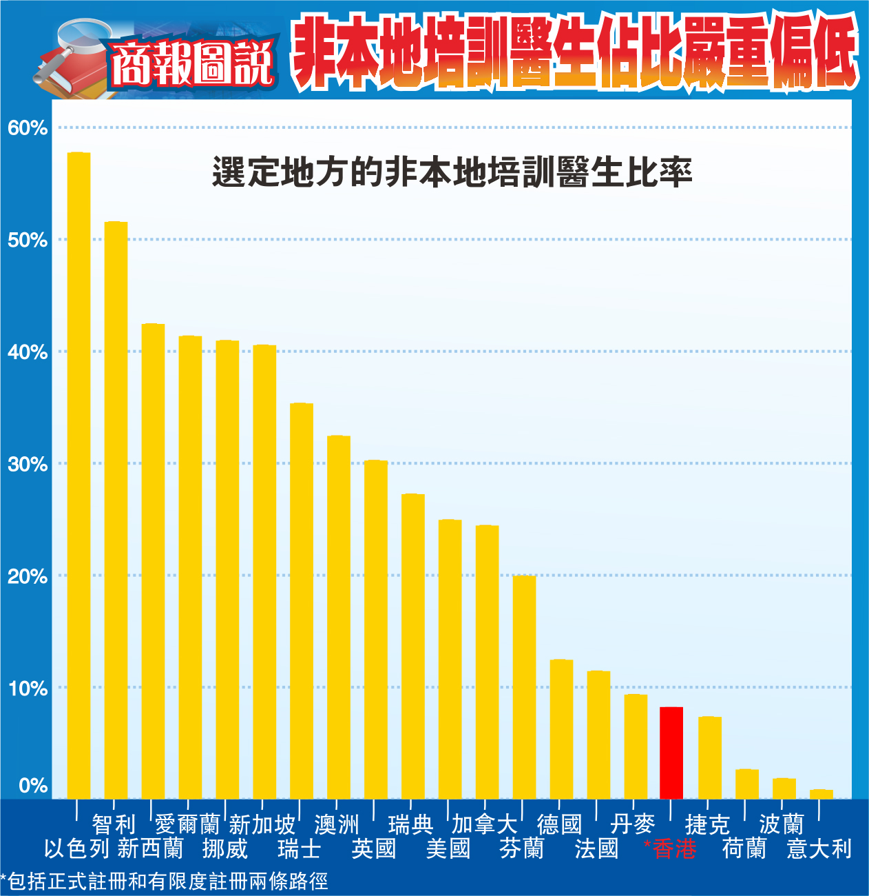 比較各個國家或地區的非本地培訓醫生佔整體醫生的比重,香港只有8.3%,明顯嚴重偏低。根據OECD資料顯示,以色列相關佔比高達57.8%,新加坡亦有超過40%,英、美則分別佔30%和25%,北歐國家也普遍介乎20%至40%。當然,個別地方如荷蘭、意大利等的比率較香港低,惟毫無疑問,世界主流都對非本地培訓醫生敞開大門。