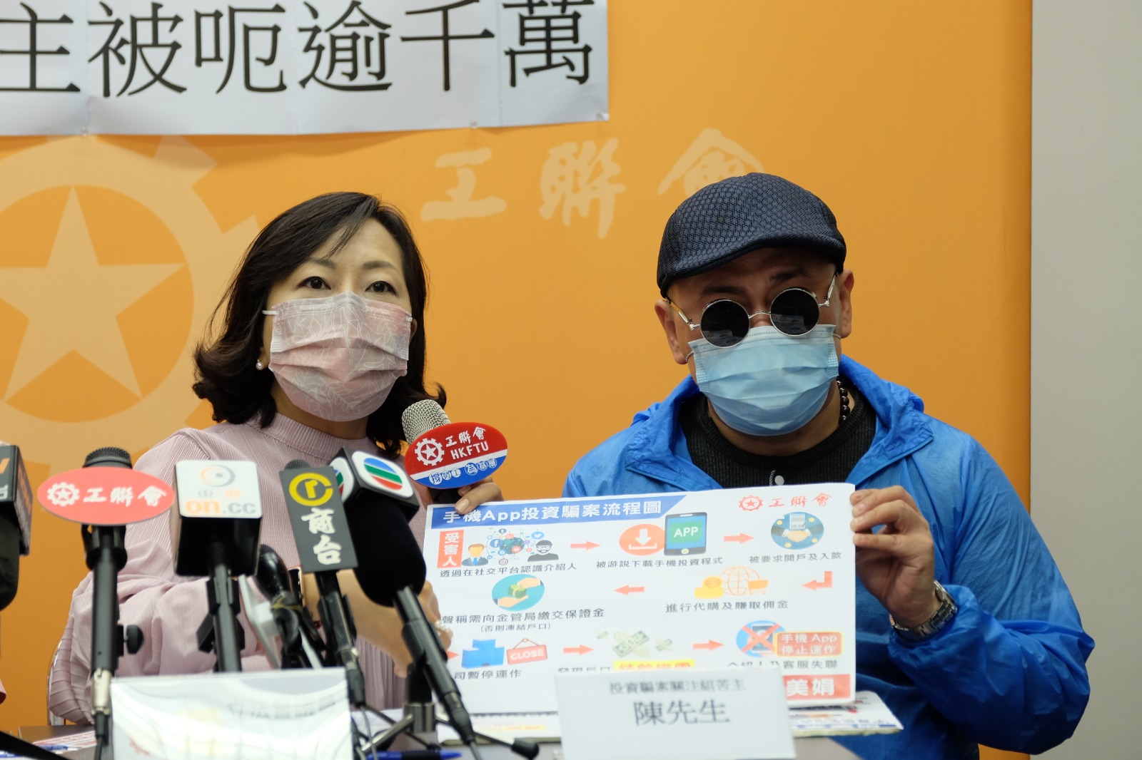 圖片說明:麥美娟與手機App投資騙案苦主陳先生講述受騙過程。