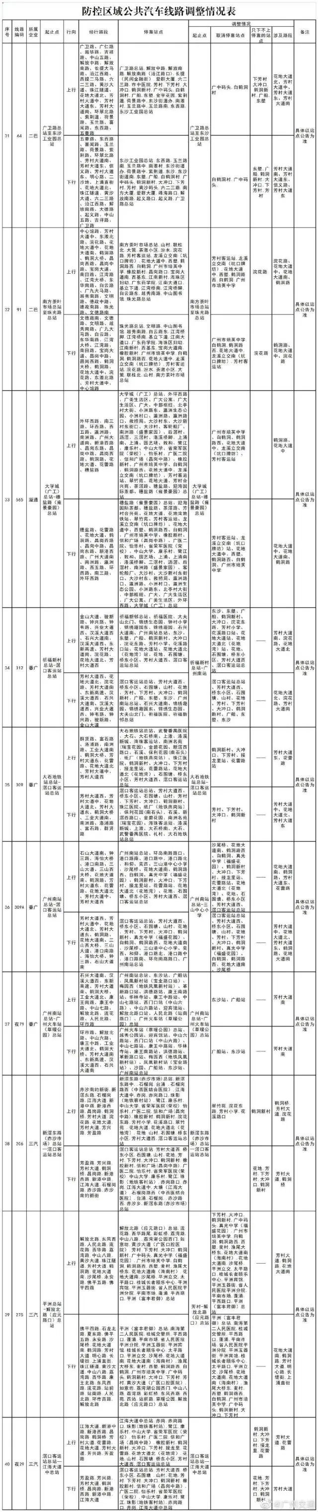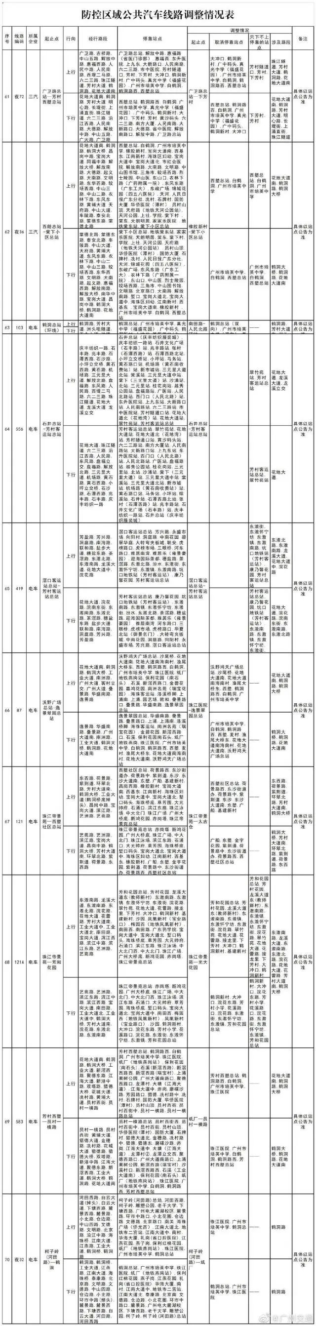 截至目前,防控區域內共有29條公交線路實施了暫停運營,40餘條公交線路取消停靠中南街道、白鶴洞街道區域站點,防控區域內的其他公交站點繼續實施乘客「只下不上」措施。