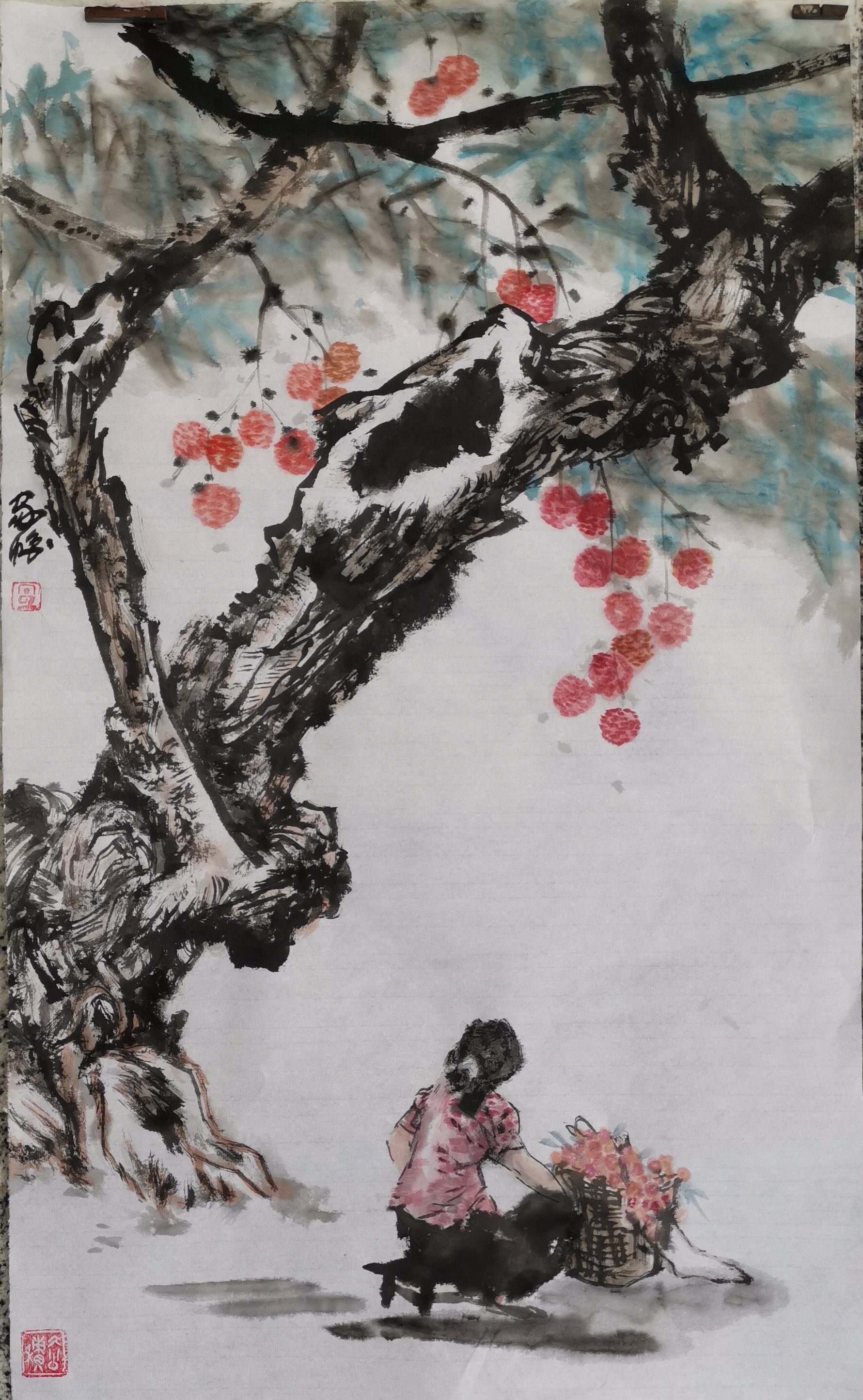朱積的《五月》畫作,雖然呈現的是「賣荔姑娘」的背景,但全景環視之下,讓人感受到嶺南賣荔姑娘那種「生於斯長於斯」的幸福感和滿足感,以及對「千年貢品,茂名荔枝」的唯美呈現和詩情畫意的浮想。(畫/朱積 文/理見)