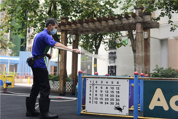 工作人員為盛譽閣樓下的兒童遊樂設施進行清潔工作。中通社