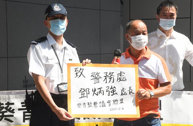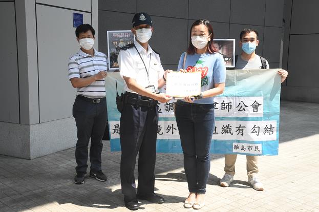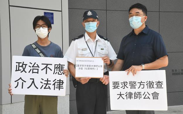 今日早上,葵青監察議會聯盟到灣仔警察總部請願,指大律師公會邀請外國政黨人員作為主席,涉嫌違反《社團條例》第5條,促請警方及社團事務主任盡快徹查大律師公會是否違反《社團條例》,並要求社團事務主任取消大律師公會的社團註冊。