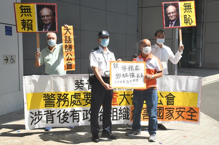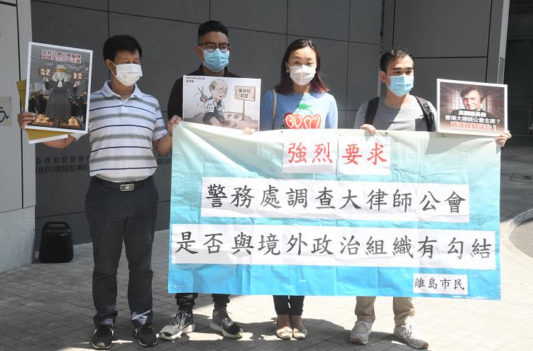 稍後,一群離島及西貢居民亦到場請願,要求警方徹查大律師公會是否違反《社團條例》及與境外政治團體勾結。有居民代表直斥夏博義自上任後已要求修改香港國安法,又多次美化黑暴,與境外反華政治組織聯繫,一直接受境外的政治利益服務,早前在香港創立人權監察,曾收過美國國家民主基金會捐款,一直受境外的政治利益服務務,欠缺中立,完全違背專業操守。(記者 蔡啟文攝)