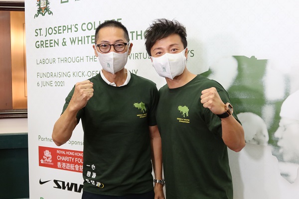鄧浩光(左)與方力申(右)以舊生身份返回母校支持「若瑟環島游」籌款活動。(攝:雲遜)
